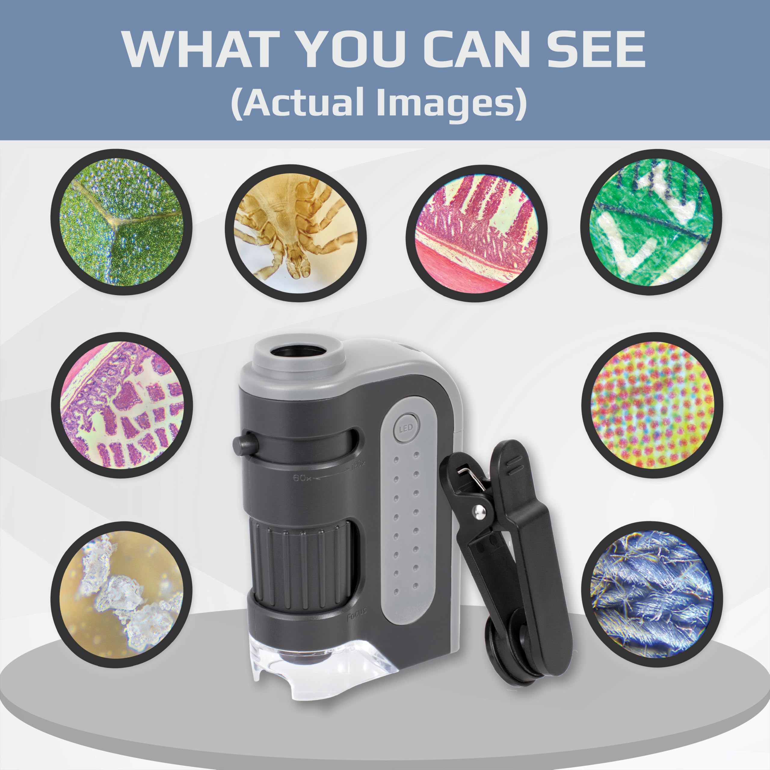 Carson MicroBrite Plus 60x-120x Accurate LED Lighted Pocket Microscope, Portable Educational STEM Toy, Mini Handheld Microscope for Student Science Lab (MM-300) , Grey